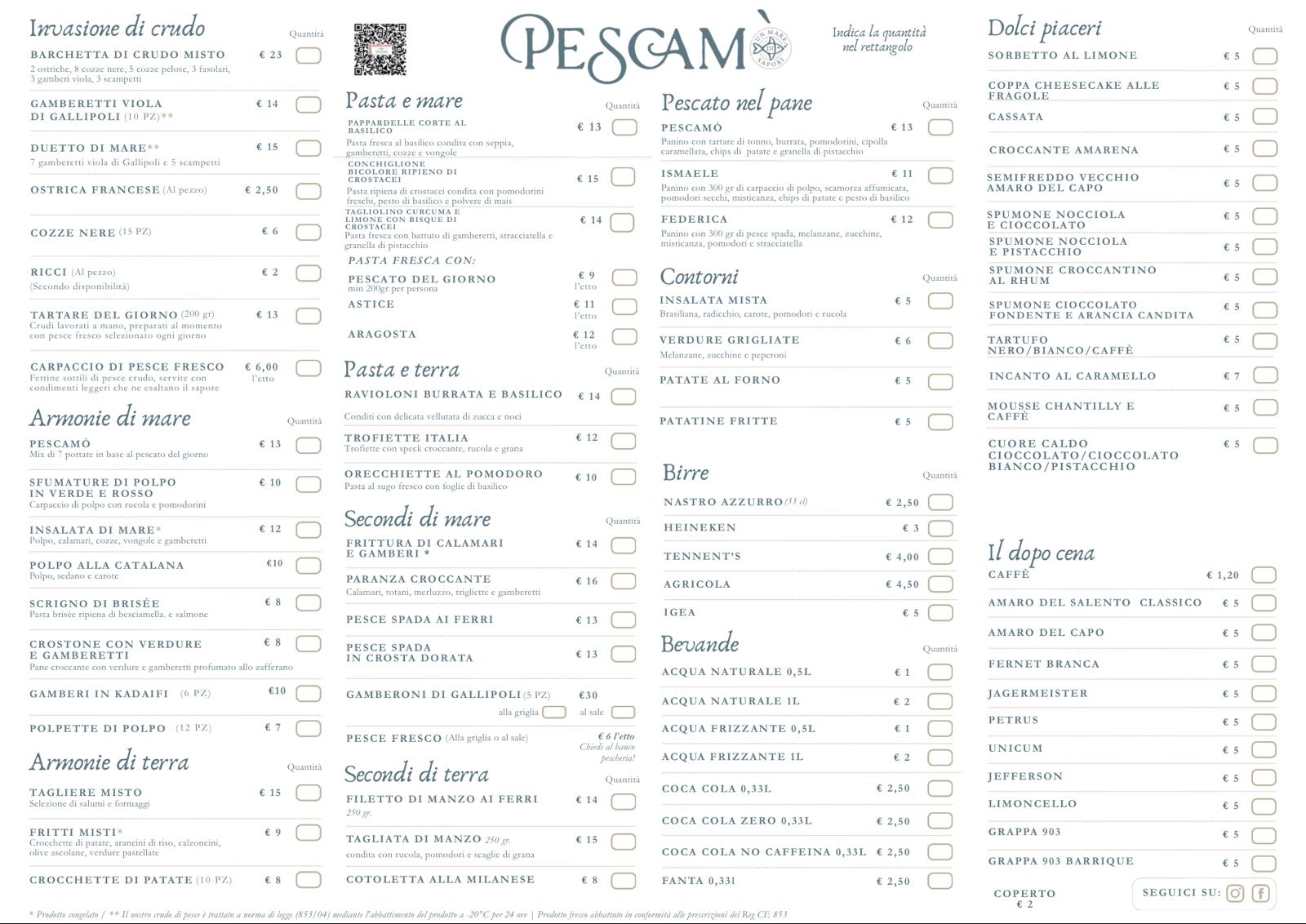 Da Pescamò puoi decidere tu come vivere il mare: acquistare il pesce da portare a casa, gustare le nostre specialità in loco o ordinare piatti da asporto per un pranzo pratico ma di qualità. Ogni preparazione valorizza la freschezza e la stagionalità del pescato locale, dal crudo al fritto, da antipasti a primi piatti, secondi e contorni con proposte anche di terra.